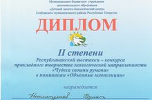 Нигметзянов Булат (руководитель Каюмова З.И.) в номинации "Объемные композиции" награжден ДИПЛОМОМ II степени.