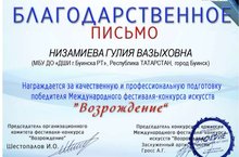 Преподаватель ДШИ Низамиева Гулия Вазыховна подготовила учащихся к Международному фестиваль-конкурсу искусств "Возрождение".