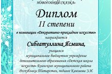 Декоратив-гамәли бүлек укучысы Сибгатуллина Ясминә "Яңа ел әкияте" VII Республика балалар иҗаты конкурсының "Декоратив-гамәли сәнгать"номинациясендә III дәрәҗә дипломанты булды. Котлыйбыз!