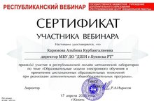 В Республиканской онлайн методической лаборатории прошел вебинар по теме "Образовательные модели электронного обучения и применения дистанционных образовательных технологий при реализации дополнительных общеобразовательных программ", где приняли участие и получили сертификаты директор ДШИ Каримова А.К., зам.директора по УР ДШИ Латыпова Р.И., зам.директора по ВР ДШИ Кузьмина Л.А.