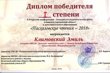 Климовский Эмиль, под руководством Фахуртдиновой Резеды Анваровны, стал обладателем Диплома Победителя I степени в X Открытой Республиканской конференции-конкурсе исследовательских работ учащихся "Пасхаловские чтения - 2018", которая проходила в городе Казани.