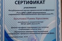 Преподаватель ДШИ Халитова Римма Харисовна участвовала и получила СЕРТИФИКАТ УЧАСТНИКА в Республиканской научно-практической конференции "Роль ДМШ и ДШИ в формировании современного образовательного пространства РТ".