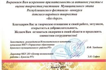 I место - вок.анс. "Шатлык нуры", в номинации "Вокальные ансамбли" (средняя группа), рук-ль Тазетдинова Н.Н.;
