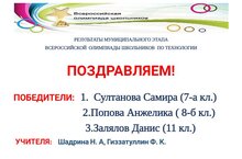 По итогам муниципального этапа Всероссийской олимпиады школьников по ТЕХНОЛОГИИ ученицы: Султанова Самира (7-а класс), Попова Анжелика (8-б класс), ученик Залялов Данис (11 класс) стали победителями. Молодцы! Желаем дальнейших успехов.