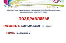 Ученица 11 класса АБЯНОВА АДЕЛЯ стала победителем муниципального этапа всероссийской олимпиады школьников по искусству. Поздравляем! Молодец! (Учитель: Шадрина Н. А.)