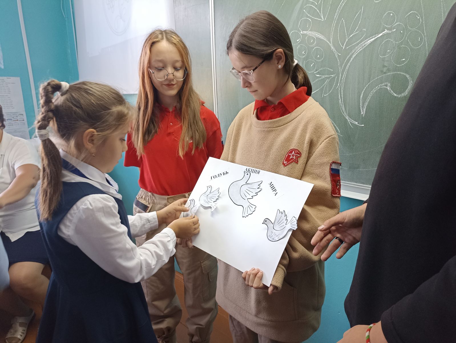 Опубликовано: 19.09.202319.09.2023 активисты Движения Первых, юнармейцы и ШУС провели акцию "Голубь мира", приуроченная к Всемирному дню Мира. Данная акция показала, насколько важен мир для всей планеты, как все мы не хотим войны и будем беречь мир ради себя и ради будущих поколений.
