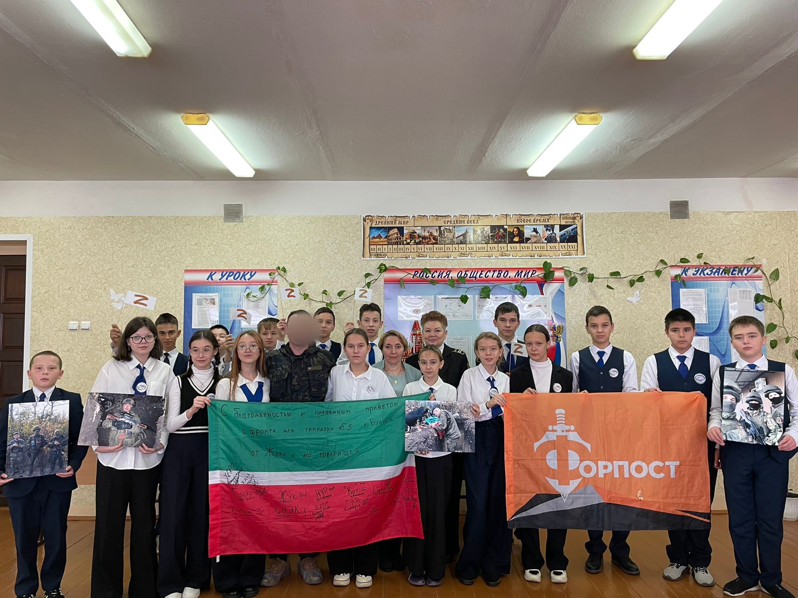 В диалоге была затронута тема помощи нашим солдатам, которая приходит из тыла. Письма с теплыми словами от детей и посылки от земляков греют душу каждому военнослужащему и поддерживают их боевой дух. Это очень важное и нужное дело. В благодарность за эту поддержку наши герои отправили нам флаг Татарстана со своими автографами и фотографии с фронта. А обучающиеся через гостя отправили им свои подарки.