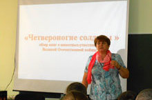 Рядом с солдатами на фронте воевали и наши меньшие братья: звери и птицы. Они совершали подвиги, не зная этого. Они просто делали то, чему их научили – и гибли, как и люди. Но, погибая, они спасали тысячи человеческих жизней. Воспитатель ГПД Трофимова Е.И. в 4 классе провела мероприятие «Четвероногие солдаты». Учащиеся узнали о животных,которые помогали на фронте, изучили книги, организовали выставку книг, отвечали на вопросы викторины. -