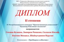 Безнең балалар бакчасы педагогы мәдәни кыйммәтләрне буыннан- буынга саклап калуга һәм тапшырылуга юнәлдерелгән эше белән "Буыннар дәвамчылыгы" республика күләмендәге конкурста катнашып, мактаулы 2 нче урынга лаек булды.