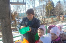 Воспитанники подготовительной группы во время прогулки угостили грачей пшенной кашей.