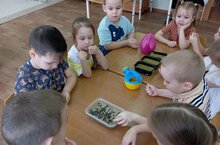 Безнең кечкенә агрономнар хәрәкәттә! Кечкенәләр төркеменә йөрүче балалар орлыкларны туфракка чәчү — шыту серләре белән беренче танышулары.