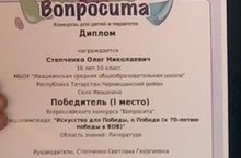 Ученик 10 класса Степченко Олег участвовал во Всероссийском конкурсе "Вопросита" и стал победителем в блиц -олимпиаде по литературе "Искусство для Победы, о Победе (к 70-летию Победы)".