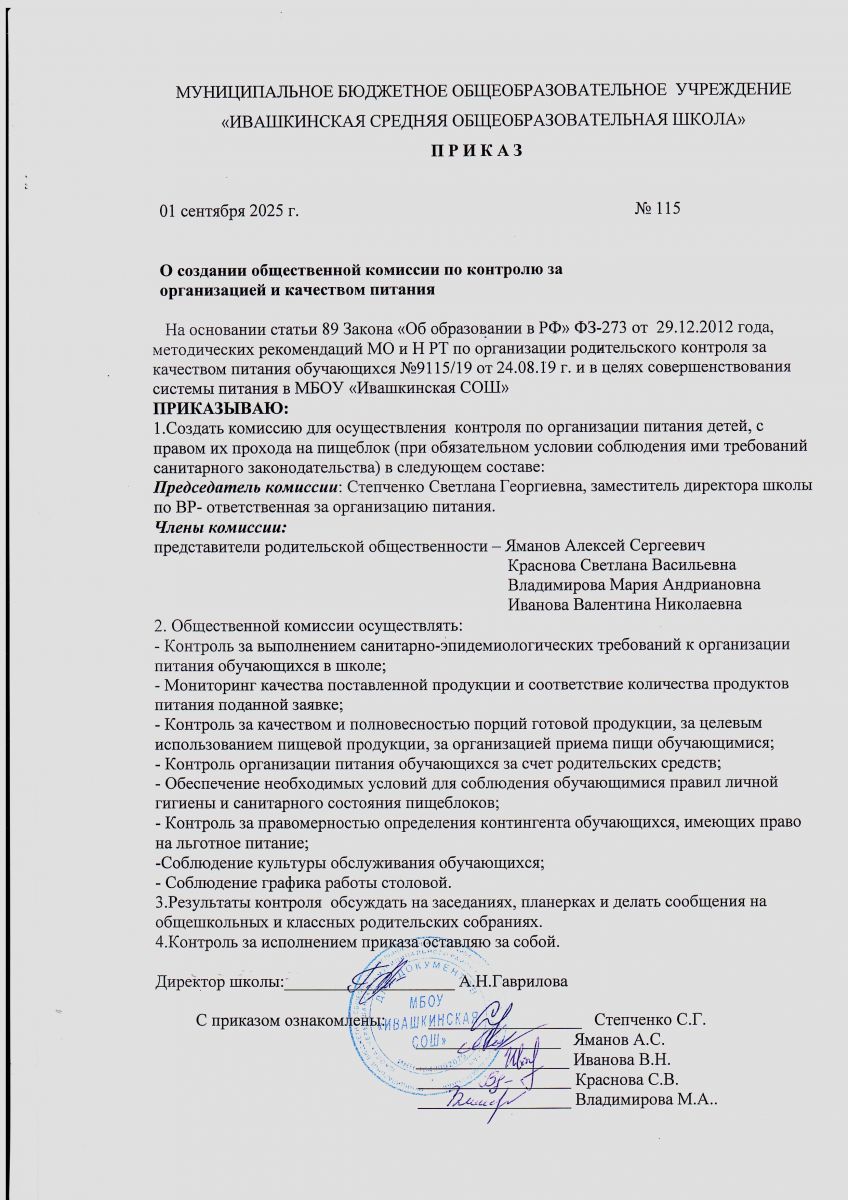Приказ о создании общественной комиссии по контролю за организацией и качеством питания