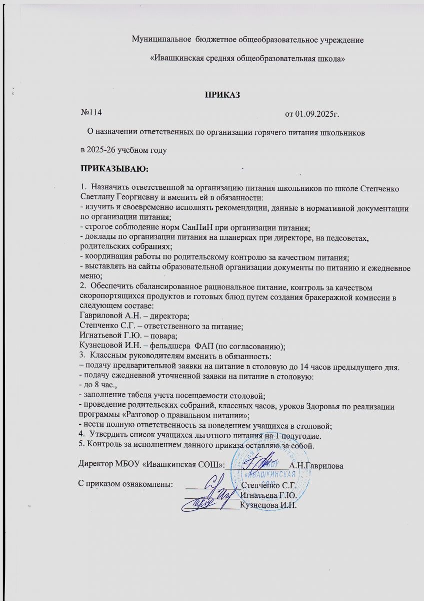 Приказ об организации питания обучающихся в МБОУ "Ивашкинская СОШ" Черемшанского муниципального района РТ в 2025-2026 учебном году
