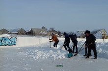 Хоккей мәйданчыгын кардан чистарту укчылар өстенә йөкләнгән. Алар бу эшне бик теләп башкара, чөнки хоккей һәркемнең яраткан уены.