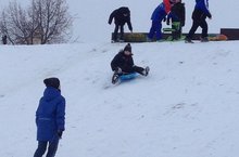По снежку на санках детиМчатся с горки, словно ветер.Кто боится в снег свалиться —Пусть на санки не садится. -