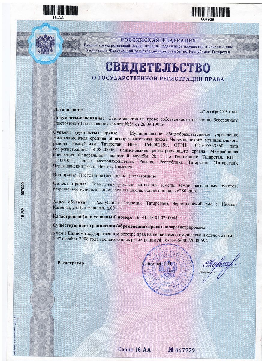 Адрес: 423114, Республика Татарстан, Черемшанский район, д. Нижняя Каменка, ул. Центральная, д.60