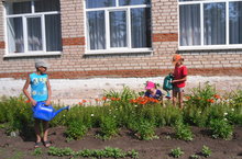 Хоть и наступило лето, а двор школы не пустует. На пришкольном участке проходят практику учащиеся пятого класса - поливают цветы, полят грядки.Благодаря их стараниям цветник школы благоухает пышными цветами, несмотря на засушливое лето.