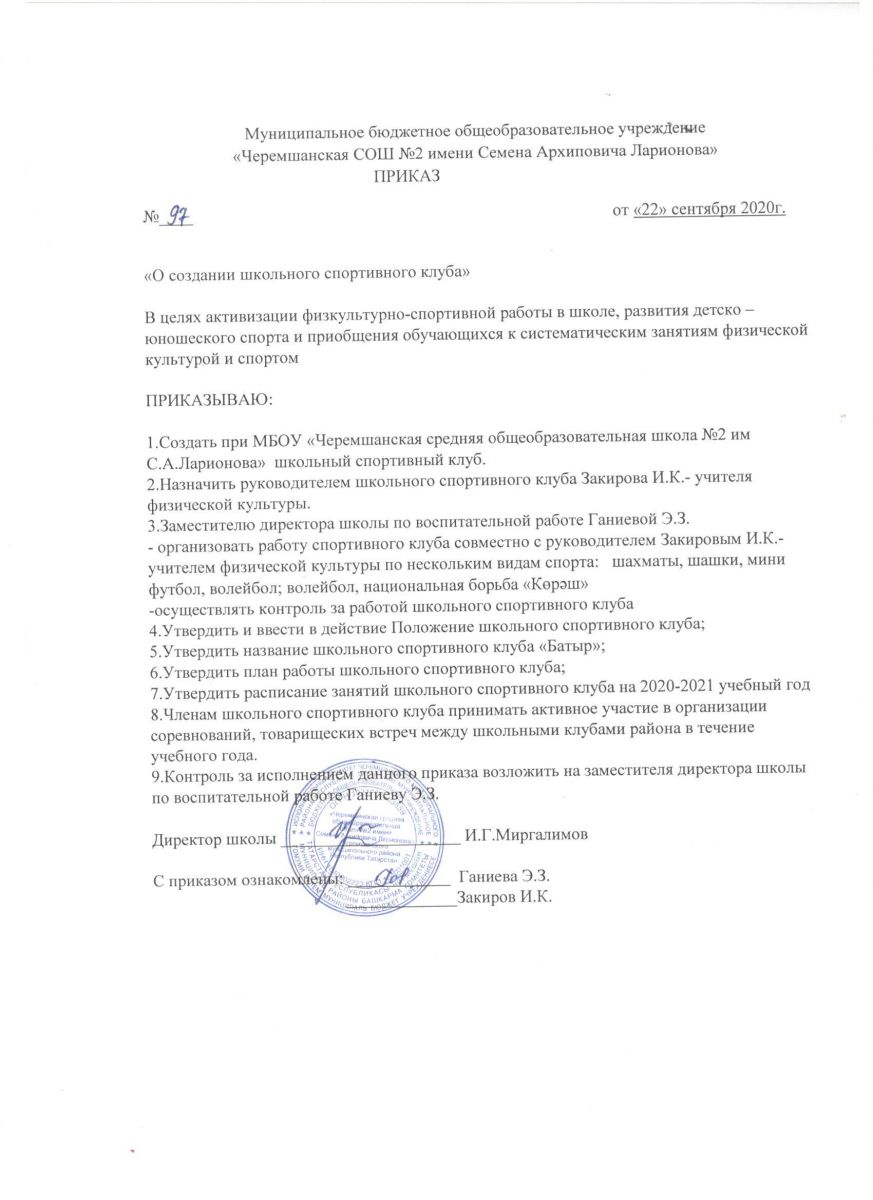 Приказ о создании Школьного спортивного клуба "Батыр"