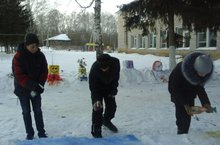 Ученики, вооружившись лопатами и лопатками, во главе с классными руководителями и учителями построили снежные фигуры на школьном дворе.