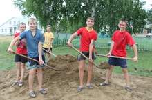 Туймәт төп белем мәктәбенең тәҗрибә участогында балалар график буенча җәйге практикаларын үтәләр.