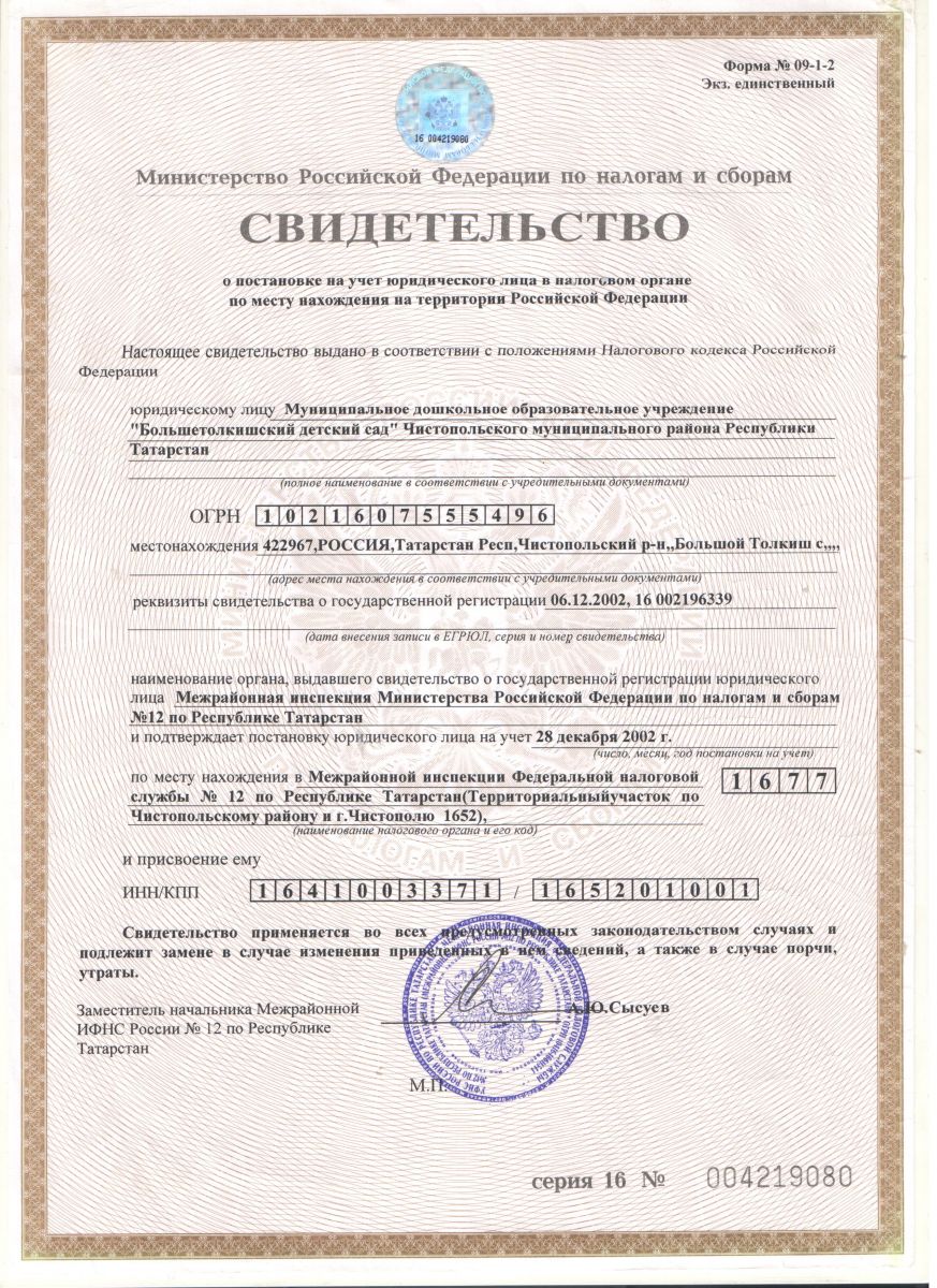 Свидетельство о постановке на учё юридического лица в налоговом органе