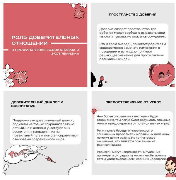 В условиях, когда радикальные идеи могут легко проникать в умы подростков, доверительный диалог становится ключевым элементом, позволяющим обсуждать сложные темы, выявлять тревожные изменения в поведении и противостоять возможному влиянию экстремистских взглядов.