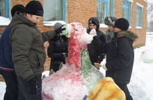 На школьном дворе кипит работа: юные скульпторы лепят из снега зимнюю сказку. Здесь и Дракоша, и Кот Ученый, и Зимняя избушка с Бабой Ягой.