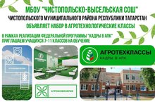 МБОУ "Чистопольско-Высельская СОШ" Чистопольского муниципального района Республики Татарстан с радостью сообщает о начале набора учащихся в 7-11 классы по профильному направлению агротехнологических классов. Данная инициатива осуществляется при поддержке Федеральной программы "Кадры в АПК".