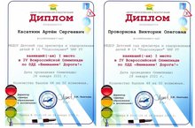 Поздравляем воспитанников Проворнову В., Касаткина А., победителей всероссийской олимпиады по ПДД "Внимание! Дорога!".