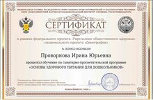 Все педагоги ДОУ в количестве 16 человек прошли дистанционное обучение по санитарно-просветительской программе на тему "Основы здорового питания для дошкольников".