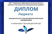Во исполнении информационного письма Волжско-Камского территориального управления Министерства экологии и природных ресурсов РТ с 7 апреля по 13 мая проведен муниципальный этап республиканской акции «#ЭКОВЕСНА2022». Наш детский стал лауреатом муниципального этапа Республиканской акции «#ЭКОВЕСНА2022»/ Татарстан Республикасы Экология һәм табигый байлыклар министрлыгының Идел-Кама территориаль идарәсенең мәгълүмати хатын үтәү йөзеннән 7 апрельдән 13 майга кадәр «#ЭкоЯз -2022» республика акциясенең муниципаль этабы үткәрелде. Безнең балалар бакчасы «#ЭКОяз -2022»республика акциясенең муниципаль этабы лауреаты булды.