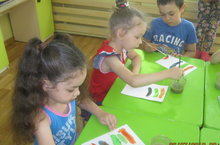 Дети учатся смешивать из трех основных цветов (красный, желтый, синий) и получать семь цветов радуги