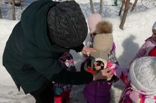 В изготовленный скворечник дети второй младшей группы с воспитателем Мифтаховой Г.М. насыпали корм для птиц.