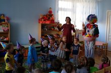 В рамках недели «Мы дружные ребята», в группе «Колобок», прошло чествование осенних именинников. Клоун Клёпа поздравил детей с днём рождения, пел с детьми «Каравай», танцевал, играл в подвижные игры.