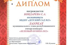 В муниципальном этапе Республиканского смотра - конкурса "Зеленый огонек - 2022" педагог нашего детского сада Бондарева Светлана Анатольевна стала лауреатом в номинации "Лучший воспитатель ДОО по обучению детей правилам безопасного поведения на дорогах и пропоганде БДД среди родителей"