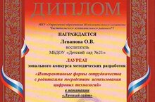 Воспитатель нашего детского сада Леванова Ольга Владимировна стала лауреатом зонального конкурса методических разработок "Интерактивные формы сотрудничества с родителями посредством использования цировых технологий" в номинации "Личный сайт"