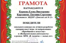 Карпова Елена Викторовна и Карташева Евгения Сергеевна стали победителями в зональном конкурсе на лучшую разработку сценария квест-игры по направлениям: "Приобщение к искусству" и "Изобразительная деятельность" в рамках МРЦ "В таланты с малых лет". Поздравляем с победой!