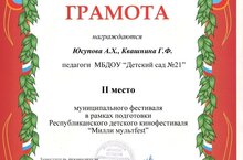 Педагоги нашего детского сада Юсупова А.Х. и Квашнина Г.Ф заняли почетное второе место в муниципальном фестивале в рамках подготовки Республиканского детского кинофестиваля "Милли мультfest".