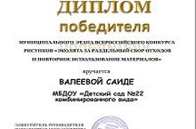С радостью поздравляем нашу воспитанницу Валееву Саиду с победой в муниципальном этапе Всероссийского конкурса рисунков «Эколята за раздельный сбор отходов и повторное использование материалов» / Шатлык белән шәкертебез Вәлиева Сәидәне муниципаль этапта җиңүе белән котлыйбыз "Калдыкларны аерым җыю һәм материалларны кабат файдаланган өчен Эколят»Бөтенроссия рәсемнәр конкурсы 10.10.2025