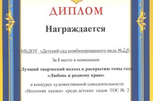 Творческая группа коллектива ДОУ заняла первое место в номинации «Лучший творческий подход к раскрытию темы года «Любовь к родному краю» в конкурсе художественной самодеятельности «Весенняя сказка» среди детских садов ТОС № 2. ПОЗДРАВЛЯЕМ!