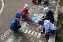 С целью привлечения внимания родительской общественности к проблемам безопасности детей на дорогах в детском саду прошёл фестиваль детского рисунка на асфальте на тему «Внимание, дорога!».