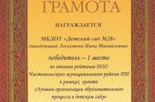 МБДОУ «Детский сад № 28» награждён Почётной грамотой МКУ «Управление образования Исполнительного комитета Чистопольского муниципального района РТ» и удостоен I места по итогам рейтинга ДОО Чистопольского муниципального района РТ в рамках гранта «Лучшая организация образовательного процесса в детском саду – 2015». Когда мы вместе – нам всё по силам!