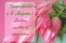 Милые женщины! Поздравляем вас с 8 Марта! Этот красивый праздник в начале весны приходит к нам, когда всё оживает, расцветает и распускается. Пусть в вашей жизни будет вечная весна, пусть ярко светит солнце, пусть поют птицы, пусть дни будут светлыми и безоблачными. Улыбок, хорошего настроения, радости, счастья!