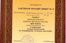 В рамках работы муниципального ресурсного центра " В таланты с малых лет" был проведен муниципальный конкурс "Мир книги" среди воспитанников 5-7 лет. Воспитанник подготовительной группы Тазетдинов И. (воспитатели Сибгатуллина Р.М. и Юнусова А.Ш.) стал лауреатом в номинации "Лучшая иллюстрация по произведению татарских писателей".