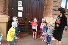 Дети старшей группы вместе с воспитателем И.В. Гориной и сказочным героем Буратино совершили увлекательную прогулку к школе № 1