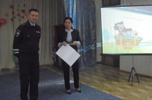 Начался новый учебный год, в котором не мало важную роль, отводится занятиям по безопасному поведения на дорогах города. С этой целью, гостью нашего дошкольного учреждения стал инспектор по пропаганде безопасносности на дорогах В.В.Воляков. На встрече с инпектором дети закрепили названия дорожных знаков, их назначение для пешеходов и водителей, поиграли в игры, отвечали на вопросы викторины и посмотрели мультфильм про непослушного пешехода. Владислав Владимирович проинструктировал детей о безопасном поведении пассажиров и пешеходов, а также подарил подарки. Встреча была дружеской и очень познавательной!