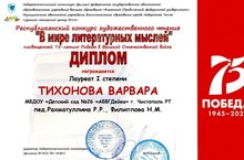 В республиканском конкурсе художественного чтения "В мире литературных мыслей", посвященном 75 - летию Победы в Великой Отечественной войне, активное участие приняли воспитанники детского сада №26. Поздравляем победителей и призеров конкурса - воспитанниц 2,5,7,9 групп.