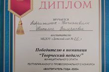 Воспитатель детского сада №26 Коврижных - Бачиашвили Татьяна Валериевна достойно представила материал из опыта педагогической деятельности на муниципальном этапе республиканского конкурса "Воспитатель года - 2020" и по итогам финала стала победителем номинации "Творческий педагог".