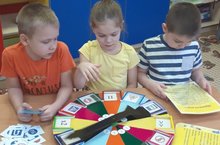 В подготовительной группе "Семицветик", ребята, закрепляют правила дорожного движения через авторское пособие "Поле чудес", разработанное педагогом Козынбаевой Н.В.